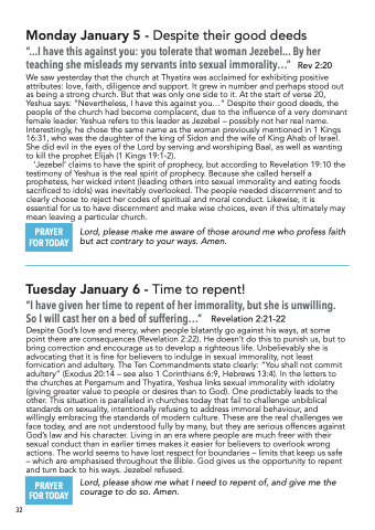 Despite God’s love and mercy, when people blatantly go against his ways, at some point there are consequences (Revelation 2:22). He doesn’t do this to punish us, but to bring correction and encourage us to develop a righteous life. Unbelievably she is advocating that it is fine for believers to indulge in sexual immorality, not least fornication and adultery. The Ten Commandments state clearly: “You shall not commit adultery” (Exodus 20:14 – see also 1 Corinthians 6:9, Hebrews 13:4). In the letters to the churches at Pergamum and Thyatira, Yeshua links sexual immorality with idolatry (giving greater value to people or desires than to God). One predictably leads to the other. This situation is paralleled in churches today that fail to challenge unbiblical standards on sexuality, intentionally refusing to address immoral behaviour, and willingly embracing the standards of modern culture. These are the real challenges we face today, and are not understood fully by many, but they are serious offences against God’s law and his character. Living in an era where people are much freer with their sexual conduct than in earlier times makes it easier for believers to overlook wrong actions. The world seems to have lost respect for boundaries – limits that keep us safe – which are emphasised throughout the Bible. God gives us the opportunity to repent and turn back to his ways. Jezebel refused.