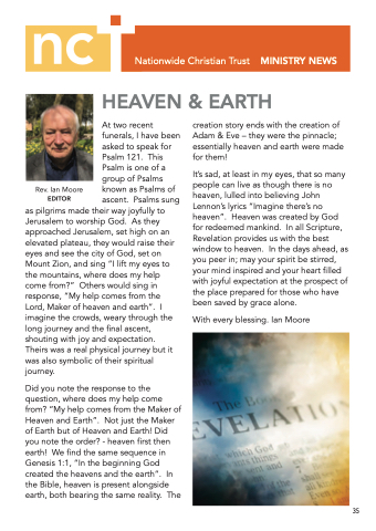 It’s sad, at least in my eyes, that so many people can live as though there is no heaven, lulled into believing John Lennon’s lyrics “Imagine there’s no heaven”. Heaven was created by God for redeemed mankind. In all Scripture, Revelation provides us with the best window to heaven. In the days ahead, as you peer in; may your spirit be stirred, your mind inspired and your heart filled with joyful expectation at the prospect of the place prepared for those who have been saved by grace alone.