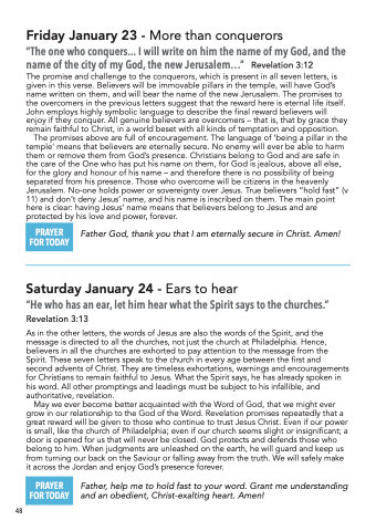 May we ever become better acquainted with the Word of God, that we might ever grow in our relationship to the God of the Word. Revelation promises repeatedly that a great reward will be given to those who continue to trust Jesus Christ. Even if our power is small, like the church of Philadelphia; even if our church seems slight or insignificant; a door is opened for us that will never be closed. God protects and defends those who belong to him. When judgments are unleashed on the earth, he will guard and keep us from turning our back on the Saviour or falling away from the truth. We will safely make it across the Jordan and enjoy God’s presence forever.