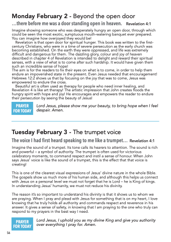 Monday February 2 - Beyond the open door ...there before me was a door standing open in heaven. Revelation 4:1