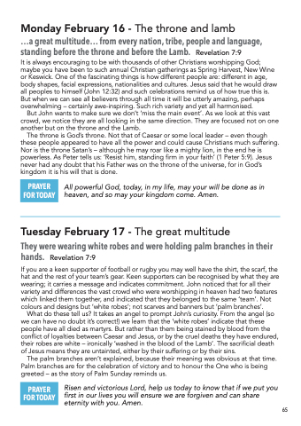 What do these tell us? It takes an angel to prompt John’s curiosity. From the angel (so we can have no doubt it’s correct!) we learn that the ‘white robes’ indicate that these people have all died as martyrs. But rather than them being stained by blood from the conflict of loyalties between Caesar and Jesus, or by the cruel deaths they have endured, their robes are white – ironically ‘washed in the blood of the Lamb’. The sacrificial death of Jesus means they are untainted, either by their suffering or by their sins.