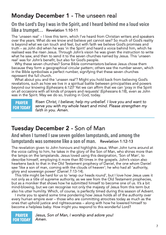 What about you and the ‘unseen real’? Might you hold back from believing God’s revelations, such as how we live in a spiritual battle between principalities and powers beyond our knowing (Ephesians 6:12)? Yet we can affirm that we can ‘pray in the Spirit on all occasions with all kinds of prayers and requests’ (Ephesians 6:18), even as John was in the Spirit. May we do so, trusting in God, today.