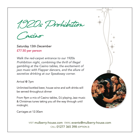 From 9pm a mix of Casino tables, DJ playing Jazz music & Christmas tunes taking you all the way through until midnight.