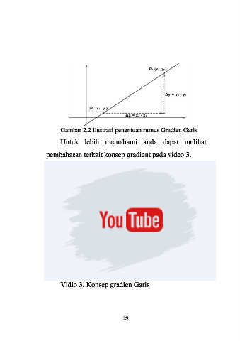 Gambar 2.2 Ilustrasi penentuan rumus Gradien Garis Untuk lebih memahami anda dapat melihat pembahasan terkait konsep gradient pada video 3. https://www.youtube.com/watch?v=BzqfsZA0Lck Vidio 3. Konsep gradien Garis 29