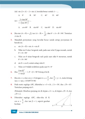 (iii) sin (2 × A) = 2 × sin A, bernilai benar untuk A = ....