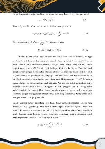 eV. Hasil eksperimen menunjukkan energi dasar atom Helium adalah -79 eV. Itu artinya