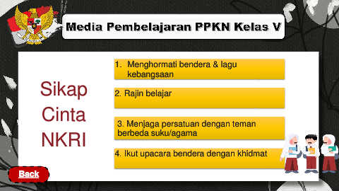 1. Menghormati bendera & lagu kebangsaan Sikap 2. Rajin belajar Cinta 3. Menjaga persatuan dengan teman NKRI berbeda suku/agama 4. Ikut upacara bendera dengan khidmat Back