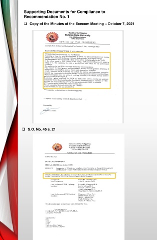 Supporting Documents for Compliance to Recommendation No. 1 ❑ Copy of the Minutes of the Execom Meeting – October 7, 2021 ❑ S.O. No. 45 s. 21
