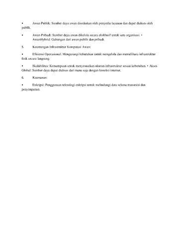 • Awan Publik: Sumber daya awan disediakan oleh penyedia layanan dan dapat diakses oleh