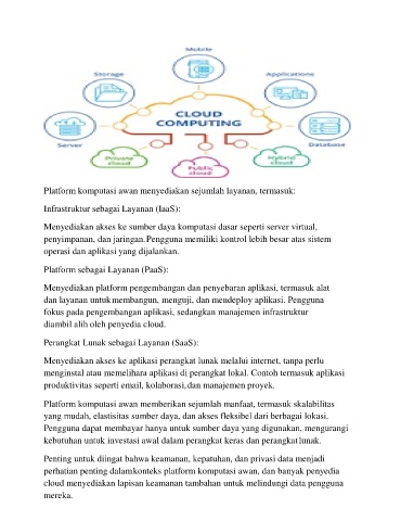 Platform komputasi awan menyediakan sejumlah layanan, termasuk: