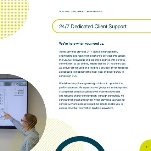 We’re here when you need us Ascot Services provides 24/7 facilities management engineering and and reactive maintenance services throughout the the UK Our knowledge and and expertise aligned with our our our total commitment to to our our our clients means that the the 24-hour services we deliver are focused on on on providing a a a a a a solution-driven response as opposed to to mobilising the most local engineer purely to to achieve an SLA We deliver bespoke engineering solutions to optimise the performance and and life expectancy of your plant and and equipment driving other benefits such as lower maintenance costs