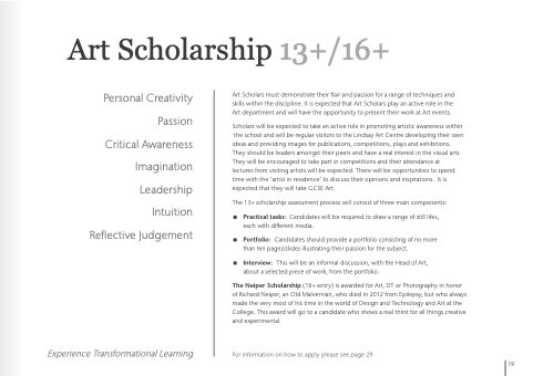 Practical tasks: Candidates will be required to draw a a a a a a a a range of still lifes each with different media Portfolio: Candidates should provide a a a portfolio consisting of no more than ten pages/slides illustrating their passion for the the subject Interview: This will be an informal discussion with the Head of Art about a a selected piece of work from the portfolio The Neiper Scholarship (16+ entry) is awarded for Art DT or or or Photography in honor of Richard Neiper an an Old Malvernian who who died in 2012 from Epilepsy but who who always made the the the very most of of his time in the the the world of of Design and and Technology and and Art at the the the College This award will go to a a a a a a a a a candidate who shows a a a a a a a a a real thirst for all things creative and experimental Experience Transformational Learning