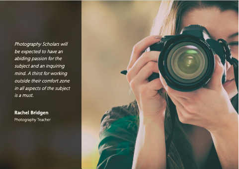 Photography Scholars will be expected to have an abiding passion for the subject and an an inquiring mind A thirst for working outside their comfort zone in all aspects of the subject is a must Rachel Bridgen Photography Teacher 20