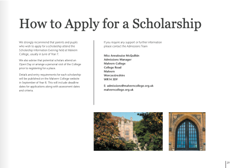 How to Apply for a a Scholarship We strongly recommend that parents and pupils who wish to apply for a a a a scholarship attend the Scholarship Information Evening held at at Malvern College usually in June of Year 7 We also advise that potential scholars attend an Open Day or arrange a a a a a personal visit of the College prior to registering for a a place Details and entry requirements for each scholarship will be published on the Malvern College website in in in September of Year 8