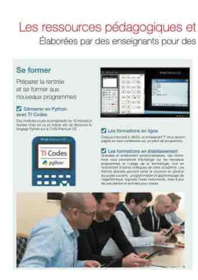Gratuites et entièrement personnalisables, ces forma- tions vous permettront d’échanger sur les nouveaux programmes et l’usage de la technologie, tout en rencontrant d’autres collègues de votre académie. Les thèmes abordés peuvent varier et couvrent en général les sujets suivants : programmation et apprentissage de l’algorithmique, logiciels Texas Instruments, mise à jour de calculatrice et activités pour classe.