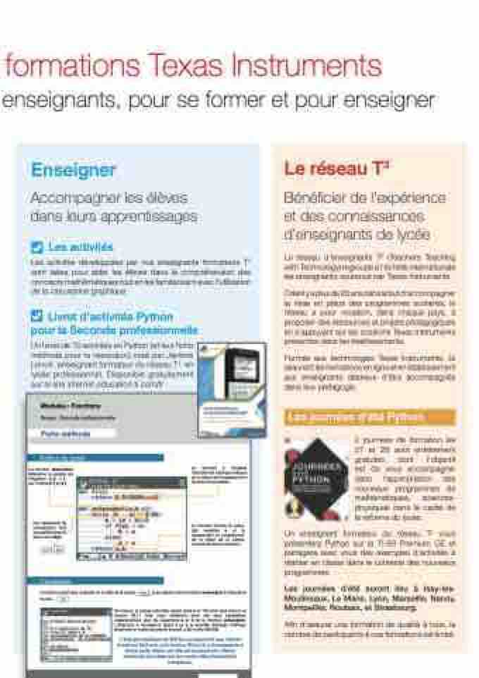 Un livret de 10 activités en Python (et leur fiche méthode pour la résolution) créé par Jérôme Lenoir, enseignant formateur du réseau T3 en lycée professionnel. Disponible gratuitement sur le site internet education.ti.com/fr