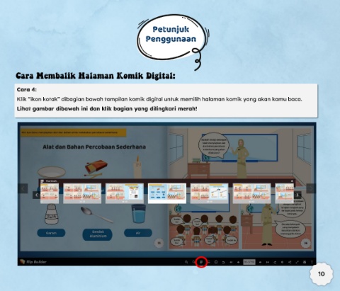 Petunjuk Penggunaan Cara Membalik Halaman Komik Digital: Cara 4: Klik “ikon kotak” dibagian bawah tampilan komik digital untuk memilih halaman komik yang akan kamu baca. Lihat gambar dibawah ini dan klik bagian yang dilingkari merah! 10