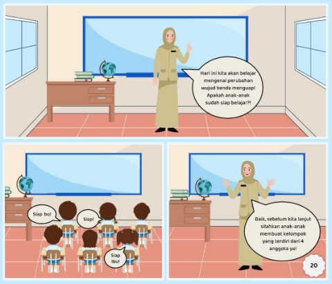 Hari ini kita akan belajar mengenai perubahan wujud benda menguap! Apakah anak-anak sudah siap belajar?! Siap bu! Siap! Baik, sebelum kita lanjut silahkan anak-anak membuat kelompok yang terdiri dari 4 anggota ya! Siap Ibu! 20