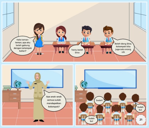 Halo teman- teman, apa aku Boleh dong Dina. boleh gabung Kelompok kita dengan kelompok Tentu boleh juga satu orang kalian? Dina nih Apa anak-anak semua sudah Sudah! mendapatkan kelompok? Sudah bu! Sudah 21 bu!