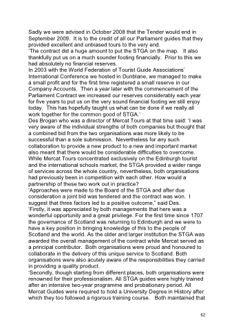 ‘Secondly, though starting from different places, both organisations were renowned for their professionalism. All STGA guides were highly trained after an intensive two-year programme and probationary period. All Mercat Guides were required to hold a University Degree in History after which they too followed a rigorous training course. Both maintained that