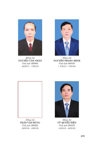 Đồng chí Đồng chí NGUYỄN VĂN NHÂN NGUYỄN TRỌNG MINH Chủ tịch HĐND Chủ tịch HĐND (6/2011 - 7/2015) ( 7/2015 - 7/2016) Đồng chí Đồng chí TRẦN VĂN HÙNG VŨ QUYẾT TIẾN Chủ tịch HĐND Chủ tịch HĐND (8/2016 - 3/2018) (4/2018 - 6/2019) 495