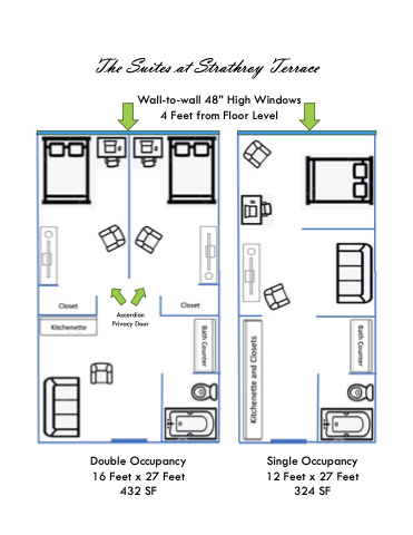 The Suites at Strathroy Terrace Wall-to-wall 48” High Windows 4 Feet from Floor Level Accordion Privacy Door Double Occupancy 16 Feet x 27 Feet 432 SF Single Occupancy 12 Feet x 27 Feet 324 SF