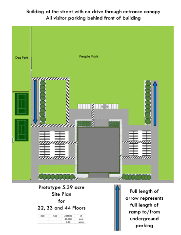 Building at the street with no drive through entrance canopy All visitor parking behind front of building Prototype 5.39 acre Site Plan for 22, 33 and 44 Floors Full length of arrow represents full length of ramp to/from underground parking