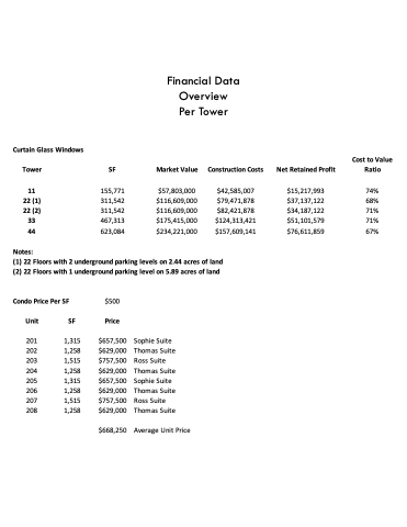 Tower SF Market Value Construction Costs Net Retained Profit Ratio