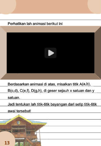 Perhatikan lah animasi berikut ini Berdasarkan animasi di atas, misalkan titik A(a,b), B(c,d), C(e,f), D(g,h), di geser sejauh x satuan dan y satuan. Jadi tentukan lah titik-titik bayangan dari setip titik-titik awal tersebut! 13