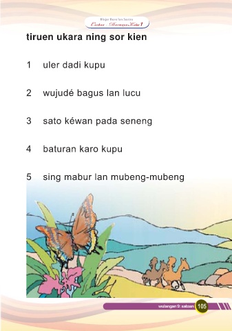 Blajar Basa lan Sastra Kelas1 Cerbon - Dermayu tiruen ukara ning sor kien 1 uler dadi kupu 2 wujudé bagus lan lucu 3 sato kéwan pada seneng 4 baturan karo kupu 5 sing mabur lan mubeng-mubeng wulangan 9: satoan 105