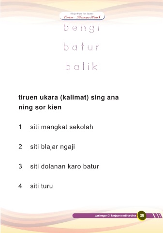 Blajar Basa lan Sastra Kelas1 Cerbon - Dermayu b e n g i b a t u r b a l i k tiruen ukara (kalimat) sing ana ning sor kien 1 siti mangkat sekolah 2 siti blajar ngaji 3 siti dolanan karo batur 4 siti turu wulangan 3: kerjaan sedina-dina 39