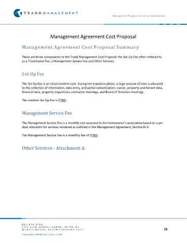 There are three components to the Tradd Management Cost Proposal: the Set-Up Fee often referred to
