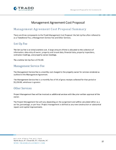 There are three components to the Tradd Management Cost Proposal: the Set-Up Fee often referred to