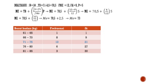 Berat badan (kg) Frekuensi fk 61 − 65 1 1 66 − 70 8 9 71 − 75 12 21 76 − 80 6 27 81 − 85 3 30