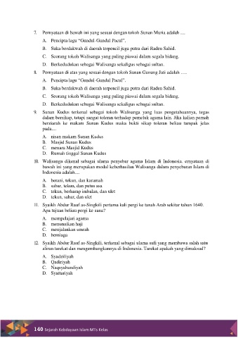 7. Pernyataan di bawah ini yang sesuai dengan tokoh Sunan Muria adalah ....