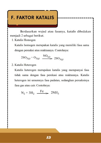 F. FAKTOR KATALIS Berdasarkan wujud atau fasanya, katalis dibedakan menjadi 2 sebagai berikut. 13