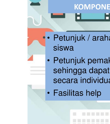 KOMPONEN PETUNJUK • Petunjuk / arahan atas respon siswa • Petunjuk pemakaian program, sehingga dapat digunakan secara individual • Fasilitas help