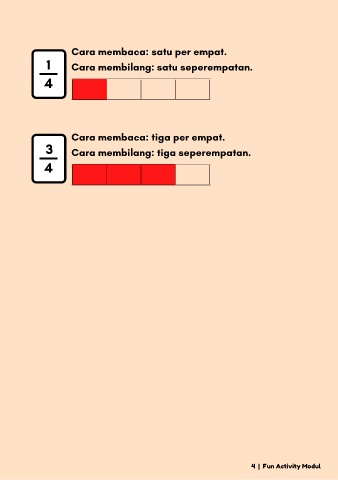 Cara membaca: satu per empat. 1 Cara membilang: satu seperempatan. 4 Cara membaca: tiga per empat. 3 Cara membilang: tiga seperempatan. 4 4 | Fun Activity Modul