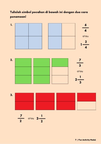 Tulislah simbol pecahan di bawah ini dengan dua cara penamaan! 1. 6 4 atau 2 1 4 2. 7 3 atau 1 2 3 3. 7 1 atau 3 2 2 7 | Fun Activity Modul