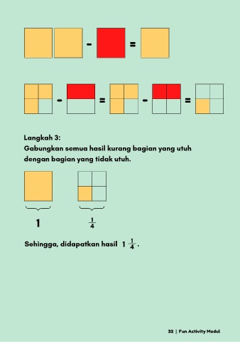 - = - = - = Langkah 3: Gabungkan semua hasil kurang bagian yang utuh dengan bagian yang tidak utuh. 1 1 4 1 1 Sehingga, didapatkan hasil . 4 32 | Fun Activity Modul