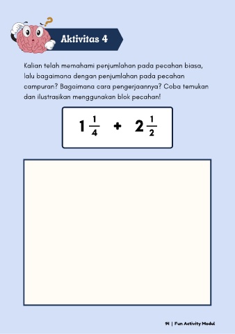 Aktivitas 4 Kalian telah memahami penjumlahan pada pecahan biasa, lalu bagaimana dengan penjumlahan pada pecahan campuran? Bagaimana cara pengerjaannya? Coba temukan dan ilustrasikan menggunakan blok pecahan! 1 1 1 4 + 2 2 14 | Fun Activity Modul