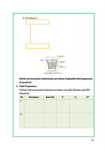 3) Percobaan 2 Setelah merancang dan melaksanakan percobaan, lengkapilah tabel pengamatan di bawah ini! A. Tabel Pengamatan Tuliskan hasil pengamatan berdasarkan percobaan yang telah dilakukan pada tabel dibawah ini No Percobaan Jenis Zat ∆ 1 2 12
