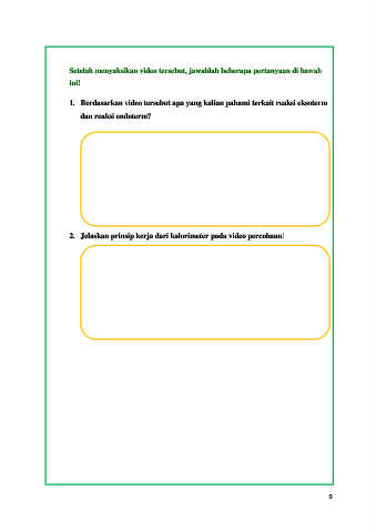 Setelah menyaksikan video tersebut, jawablah beberapa pertanyaan di bawah ini! 1. Berdasarkan video tersebut apa yang kalian pahami terkait reaksi eksoterm dan reaksi endoterm? 2. Jelaskan prinsip kerja dari kalorimeter pada video percobaan! 9