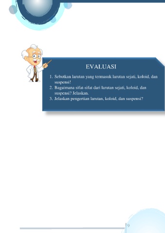 EVALUASI 1. Sebutkan larutan yang termasuk larutan sejati, koloid, dan suspensi! 2. Bagaimana sifat-sifat dari larutan sejati, koloid, dan suspensi? Jelaskan. 3. Jelaskan pengertian larutan, koloid, dan suspensi? 9