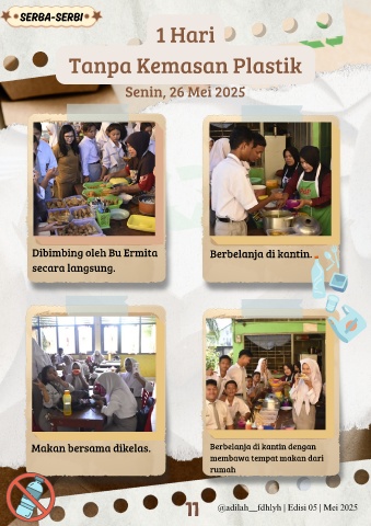 SERBA-SERBI 1 Hari Tanpa Kemasan Plastik Senin, 26 Mei 2025 Dibimbing oleh Bu Ermita Berbelanja di kantin. secara langsung. Makan bersama dikelas. Berbelanja di kantin dengan membawa tempat makan dari rumah 11 @adilah__fdhlyh | Edisi 05 | Mei 2025