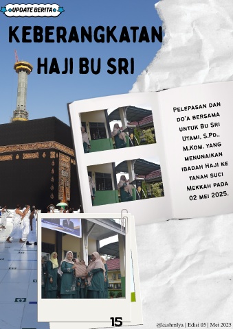 UPDATE BERITA Keberangkatan Haji Bu Sri Pelepasan dan do’a bersama untuk Bu Sri Utami, S.Pd., M.Kom. yang menunaikan ibadah Haji ke tanah suci Mekkah pada 02 mei 2025. 15 @kashmlya | Edisi 05 | Mei 2025