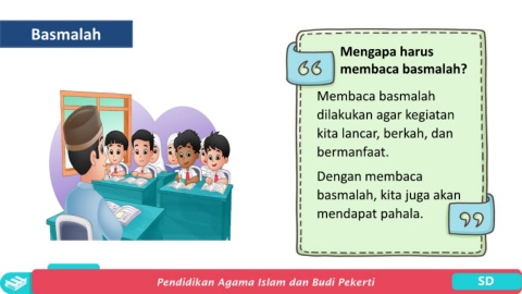 Basmalah Mengapa harus membaca basmalah? Membaca basmalah dilakukan agar kegiatan kita lancar, berkah, dan bermanfaat. Dengan membaca basmalah, kita juga akan mendapat pahala.