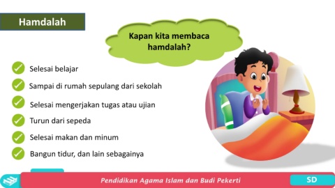 Hamdalah Kapan kita membaca hamdalah? Selesai belajar Sampai di rumah sepulang dari sekolah Selesai mengerjakan tugas atau ujian Turun dari sepeda Selesai makan dan minum Bangun tidur, dan lain sebagainya