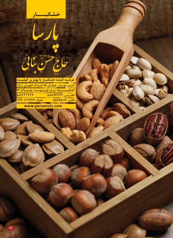 راـــبکشخ تـیفیک نیرتهب اب راـبکشخ هدننک هـضرع رازاـب یاـهتنا ،دادرـخ 15 ناـبایخ ،نارـهت :سردآ 17 کاــــلپ ،اـــهینیوزق یارس ،اهرـــــگنهآ 55631224 55894939 :نـــفلت 0912-6021713 :هارمه 55895066 :سکف www.parsanuts.com 45