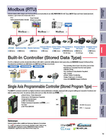 Oriental Motor offers single axis Modbus (RTU) communication in our AZ, PKP/CVD RS-485 Type, BLV R Type and linear based products.   Hybrid Control